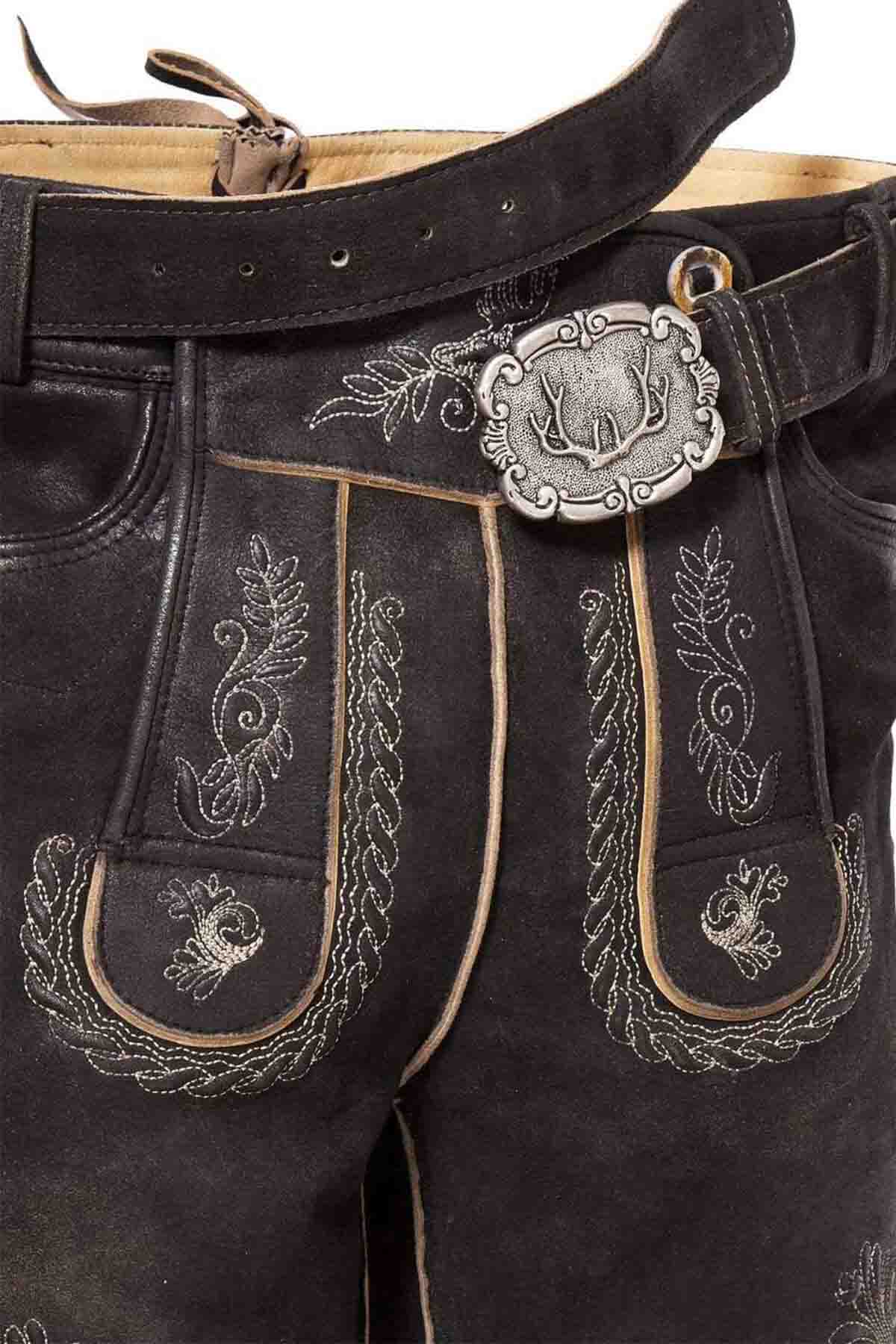 This piece presents a deep, antique-toned suede look with ornate embroidery across the front flap, thighs, and side panel. Light contrast piping sharpens the silhouette, while the deer buckle and buttoned leg hems add heritage charm. It reflects refined Trachten Lederhosen craftsmanship with Bundhosen appeal for polished traditional dressing today.