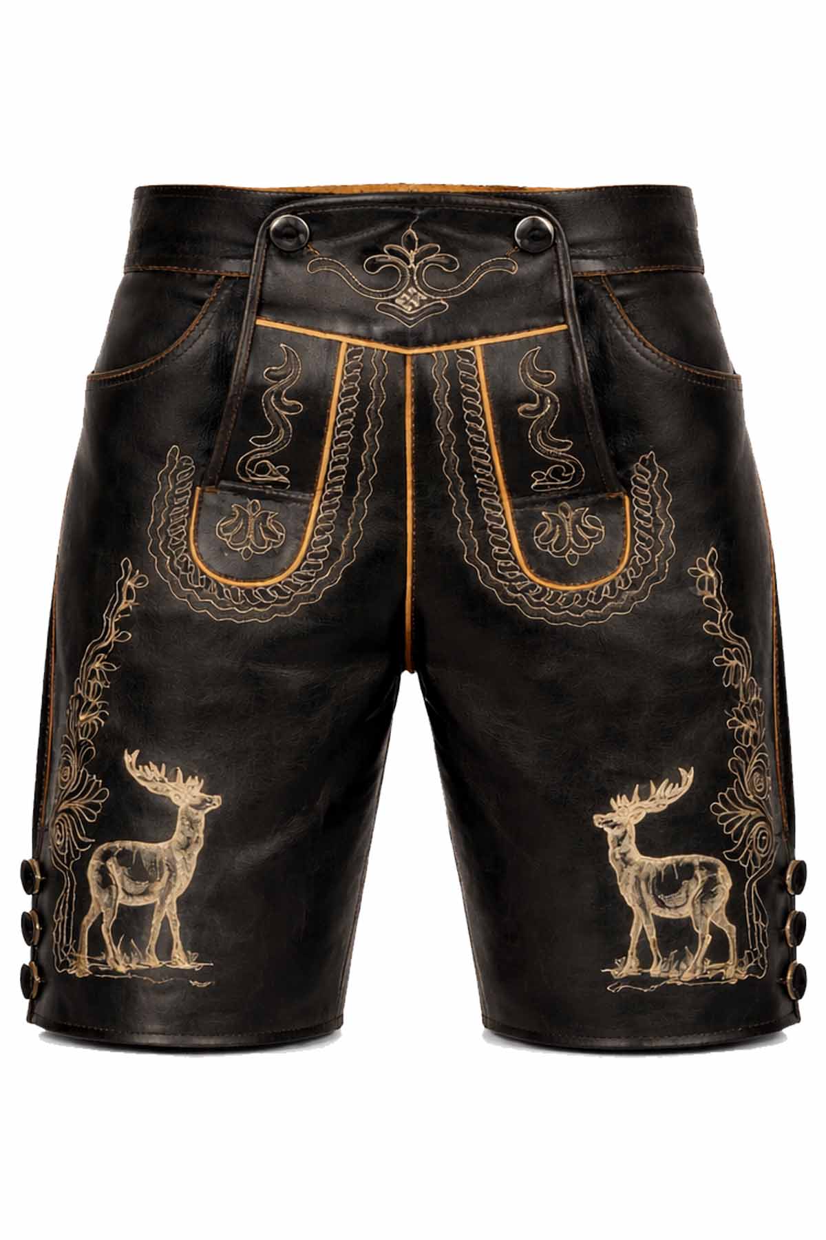 Crafted by Bavaria Attire, this piece reflects true Bavarian tradition with a modern, wearable edge. Made from premium goat suede leather, the texture feels exceptionally soft, smooth, and naturally flexible against the skin. The rich deep brown tone carries a subtle vintage depth, enhanced by warm contrast piping and intricate embroidery that highlights the front panel with elegant precision. Delicate stag motifs on each leg add a bold heritage character, while the structured stitching ensures durability without sacrificing comfort. Designed for versatility, it pairs effortlessly with Trachten Jackets and Trachten Socks, making it ideal for festive occasions or cultural gatherings. Whether styled as classic Lederhosen Shorts or inspired by Traditional Bundhosen aesthetics, it delivers a refined balance of authenticity and everyday ease.