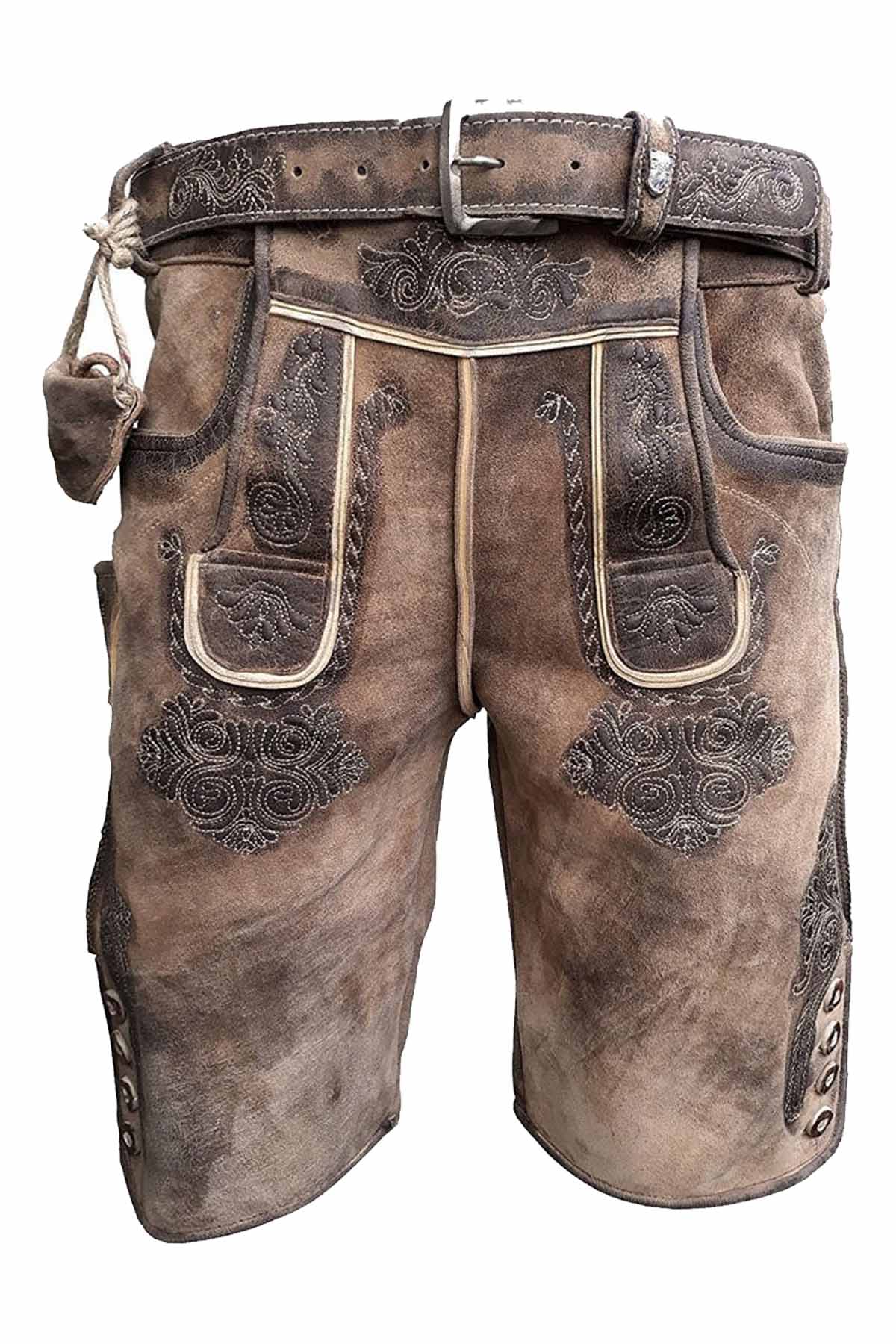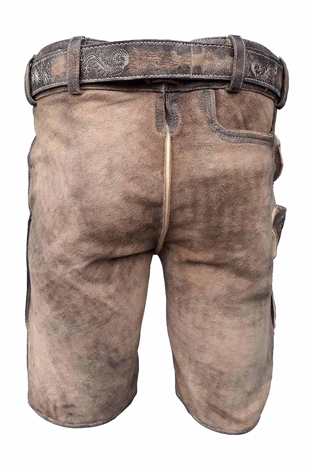 This lederhosen shows a handsome aged taupe-brown surface with darker embroidered panels, ivory contrast piping, side button detailing, and a matching belt that sharpens the traditional silhouette. Its balanced design makes it easy to style with Lederhosen Shoes and German Jackets, creating a complete festive outfit with refined Alpine character.