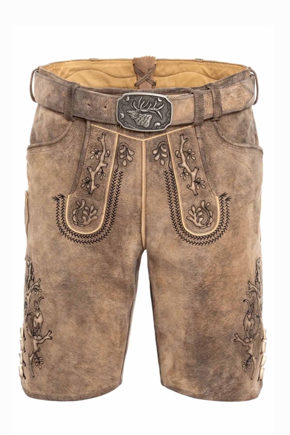 These shorts stand out for their soft goat suede leather, distressed taupe finish, contrast piping, detailed embroidery, and decorative stag buckle belt. They offer traditional Bavarian styling with a comfortable structure, making them a strong choice for Oktoberfest, cultural gatherings, festive dinners, and heritage-inspired seasonal wear with polished appeal today.