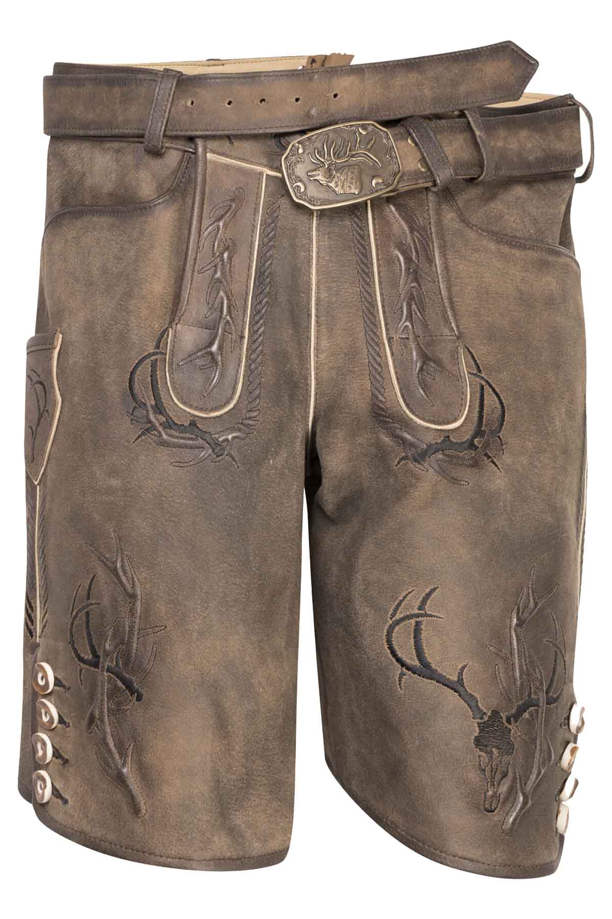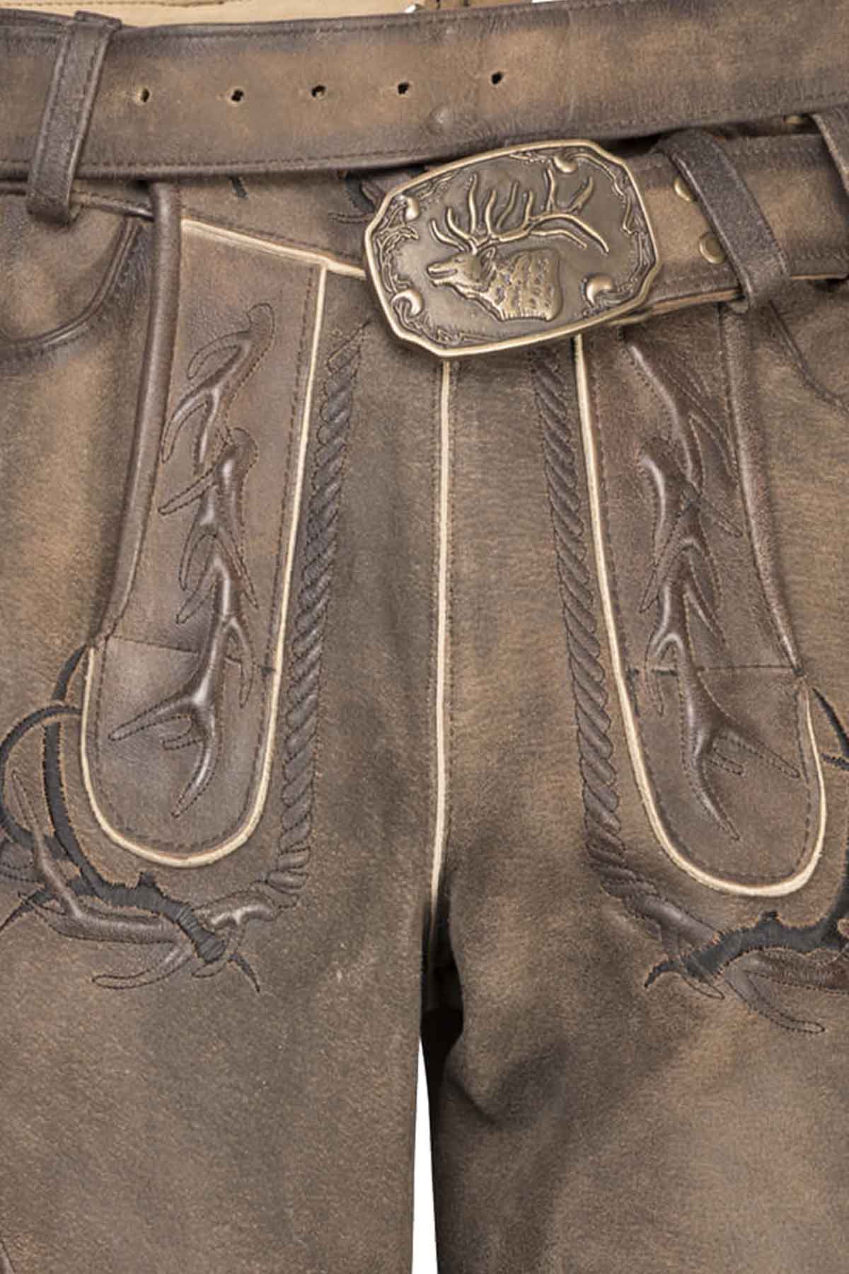 This lederhosen showcases a rich aged-brown finish with soft tonal variation, striking stag embroidery, contrast piping, and a traditional fall-front design. The matching belt and antique-style buckle strengthen its heritage look, while the smooth goat suede leather, side pocket, and horn-style buttons make it practical, comfortable, and distinctly festive overall.