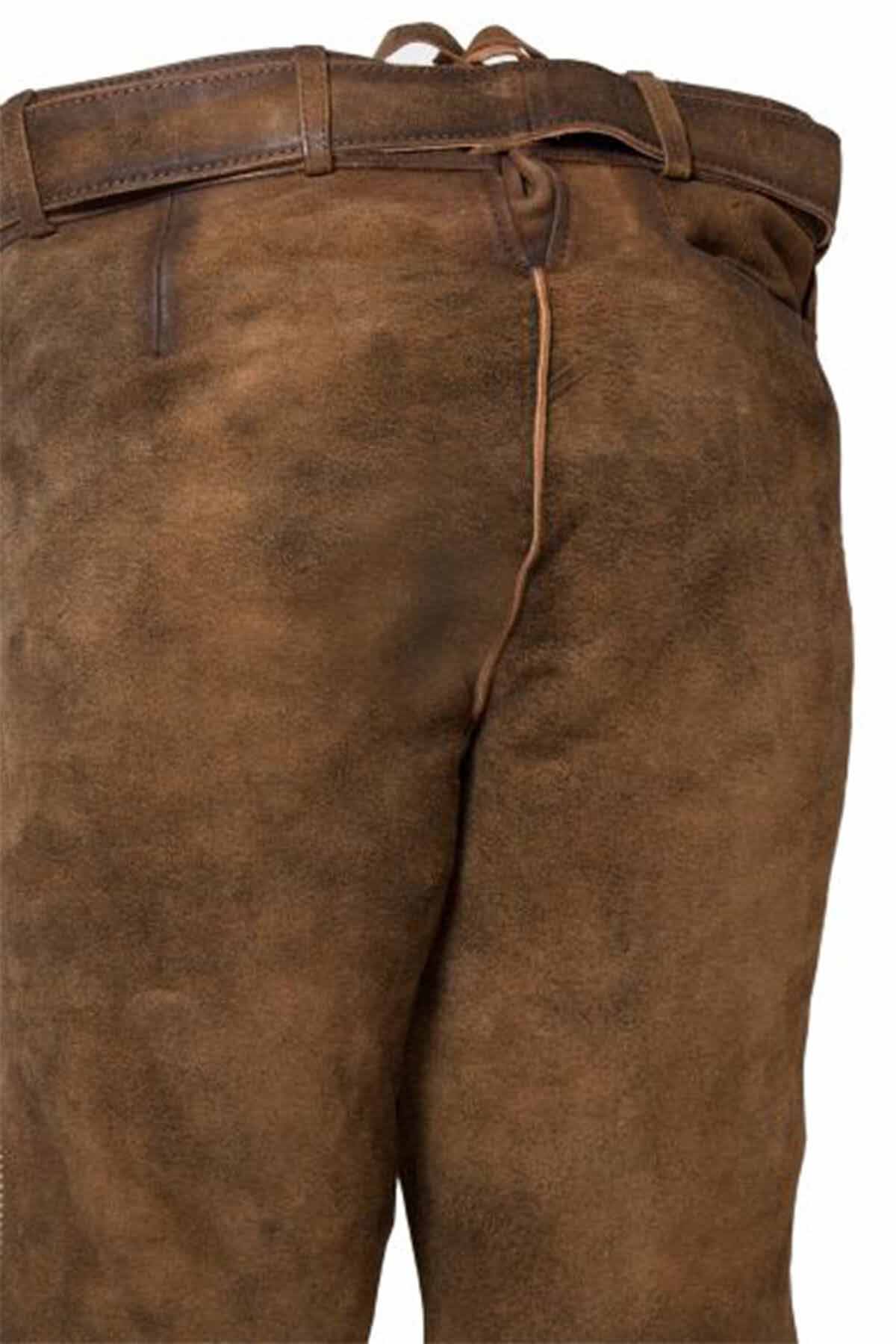 This traditional knee-length design captures classic Bavarian character through rich antique brown suede, decorative embroidery, side pocket detailing, and tied cuffs. The silhouette feels balanced, masculine, and easy to wear, while the included belt adds structure. It styles beautifully with waistcoats, shirts, and Trachten Socks for polished festive dressing today.