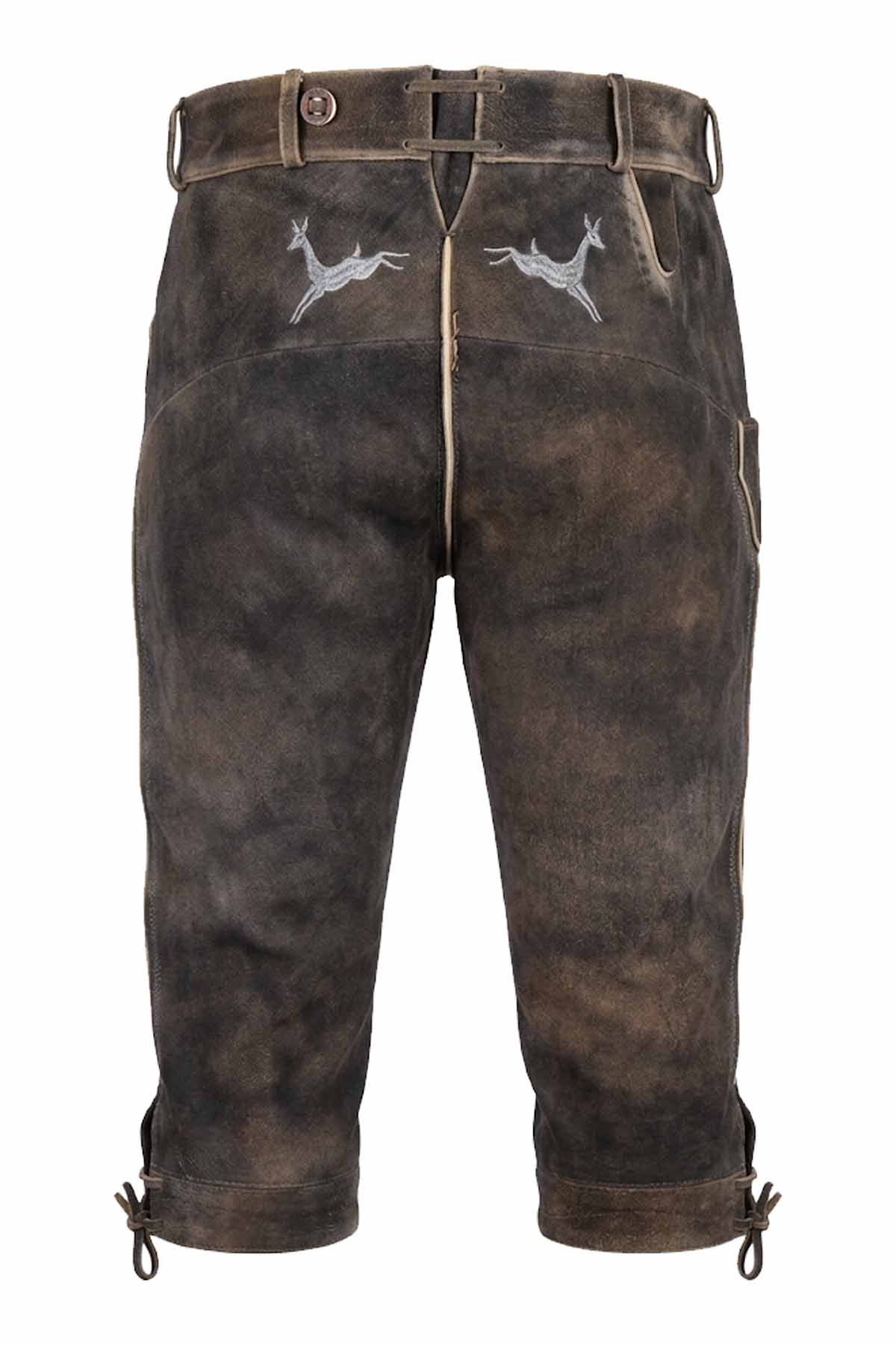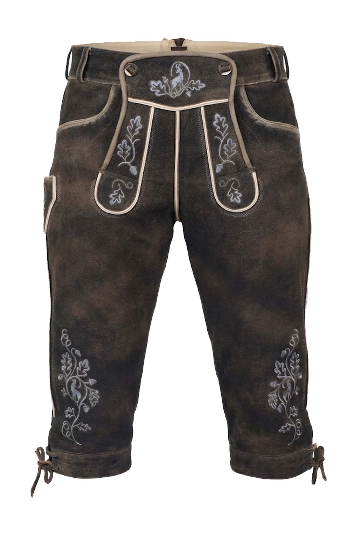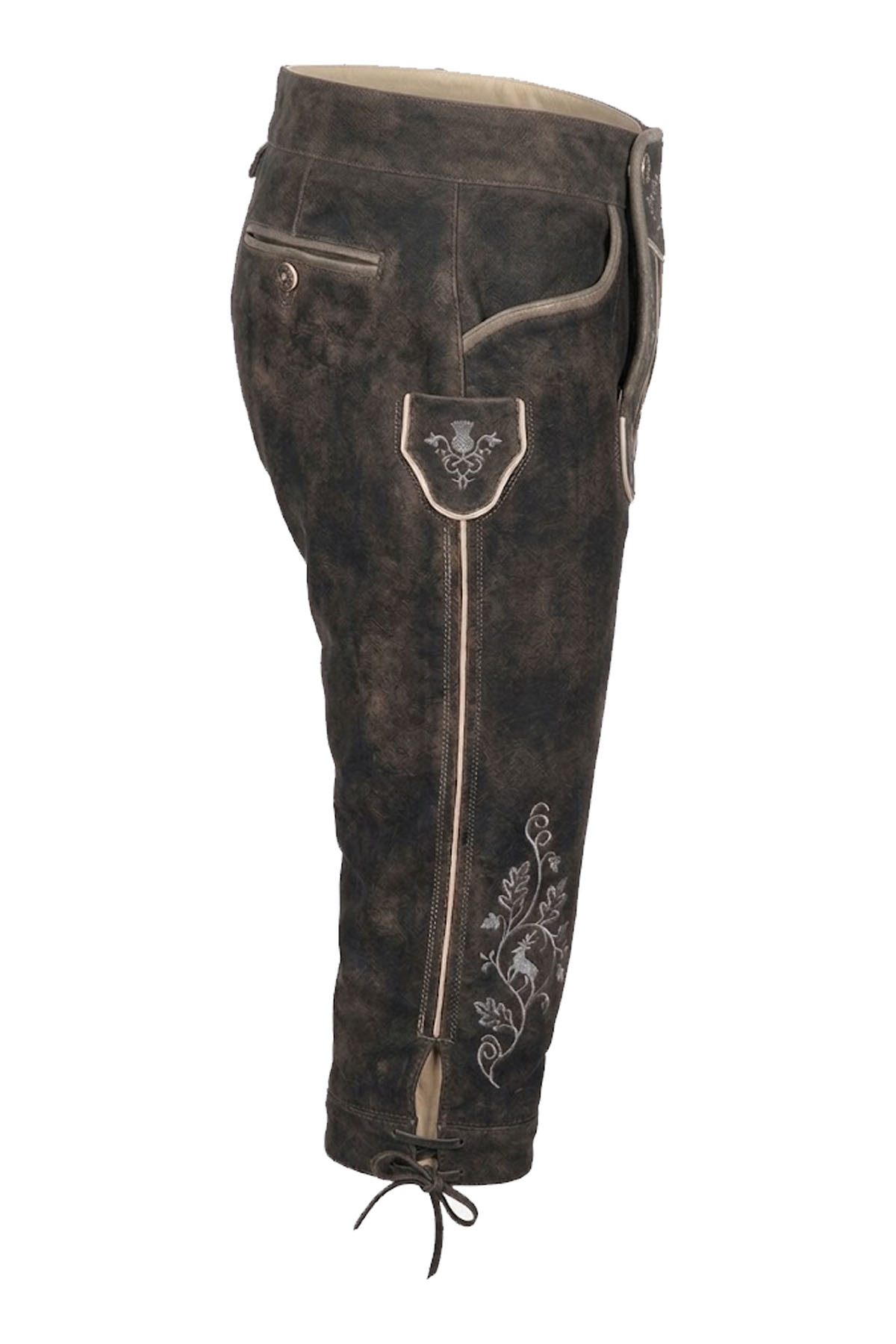 The Hofbräuhaus Bundhosen by Bavaria Attire captures the spirit of classic Bavarian style through rich goat suede leather that feels velvety, supple, and naturally breathable. Its deep charcoal-brown tone carries a softly aged finish, enhanced by subtle tonal variations that add depth and character. Fine embroidery across the front flap and lower legs reflects traditional artistry, while clean contrast piping defines the silhouette with precision. Designed as Knee-Length Lederhosen, this piece offers a structured yet comfortable fit ideal for long wear at festivals or gatherings. Thoughtfully crafted stitching ensures durability, while its authentic appeal pairs effortlessly with Trachten Waistcoats and Trachten Shoes. These German Lederhosen Shorts deliver heritage elegance with a modern sense of comfort and confidence.