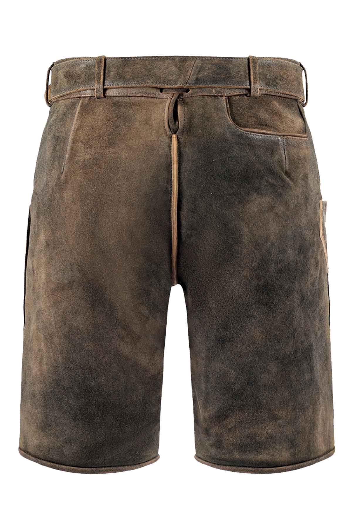 This lederhosen shows a classic short-length silhouette with soft texture, contrast piping, floral embroidery, and a statement buckle that gives it strong traditional character. The suede surface looks naturally weathered, while the neat construction keeps it comfortable and polished. It is ideal for festive wear, heritage styling, and seasonal use.