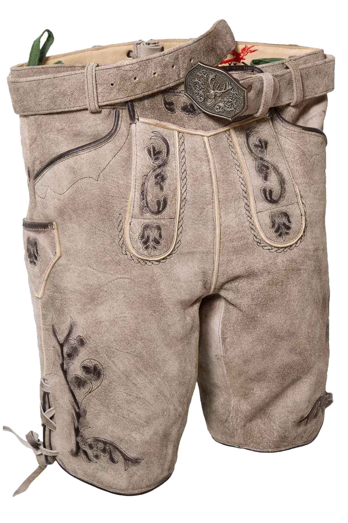 This pair showcases a refined light taupe shade with dark floral embroidery, curved contrast piping, and a traditional flap front that gives it a polished Bavarian character. The suede surface looks soft and velvety, while the matching belt, side pocket, and hem lacing complete its heritage-inspired finish beautifully with ease.