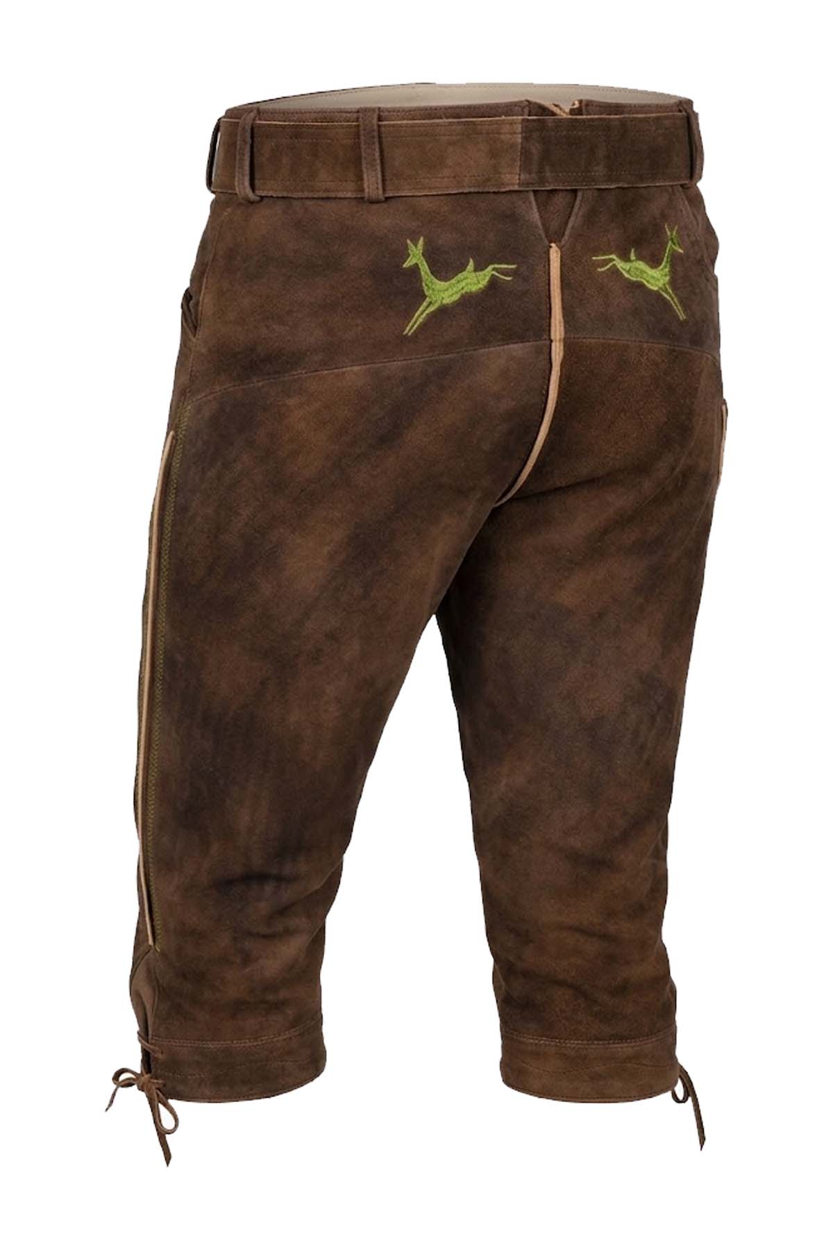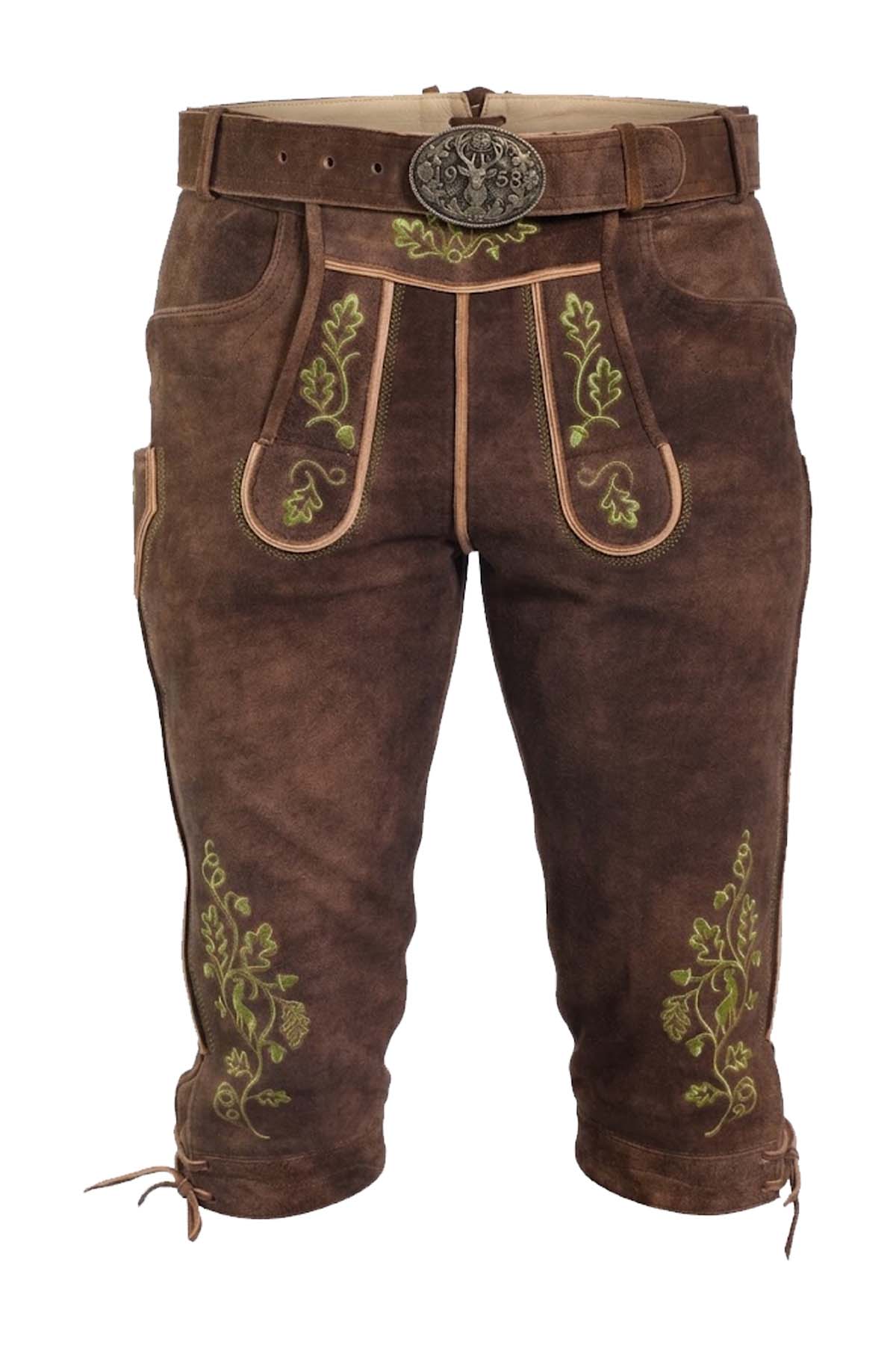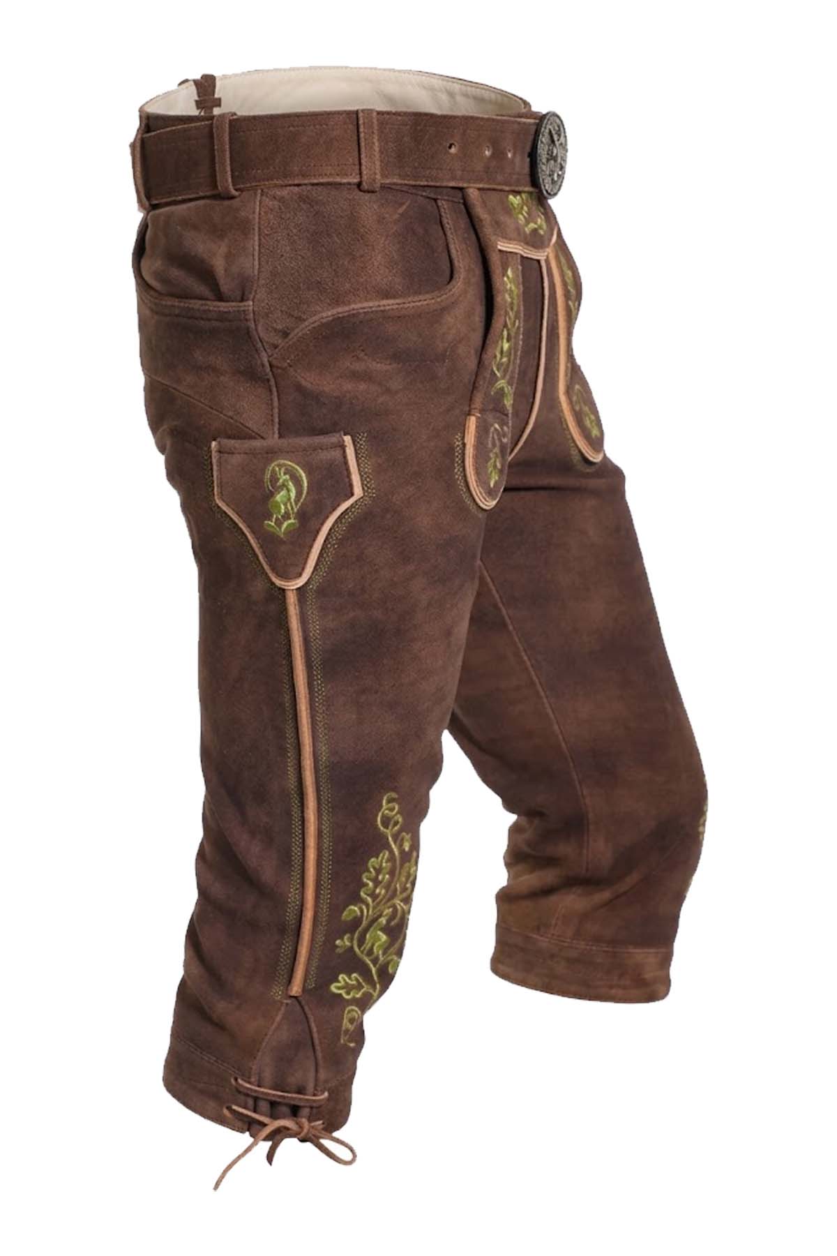 The Neuschwanstein Bundhosen by Bavaria Attire captures the essence of traditional Bavarian tailoring with a refined modern touch. Crafted from premium goat suede leather, it offers a luxuriously soft, velvety texture that feels supple yet durable against the skin. The rich earthy brown tone features subtle vintage shading, enhancing its authentic character while complementing the delicate green embroidery inspired by alpine foliage. Precision stitching and clean piping define its structure, while the knee-length cut reflects the timeless appeal of Knee-Length Bundhosen. Designed for both comfort and style, this piece pairs effortlessly with Trachten Waistcoats and Trachten Shoes, making it a standout choice among German Lederhosen Shorts for festivals or cultural occasions.