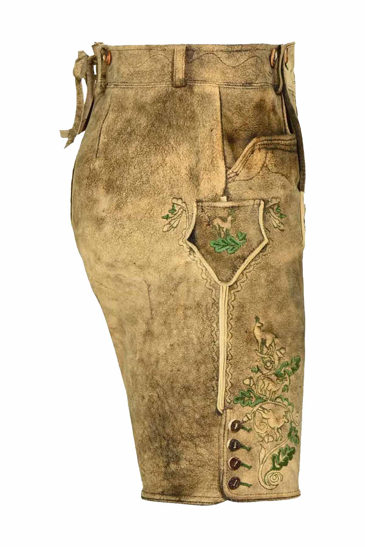This lederhosen reflects true Bavarian heritage with its soft goat suede leather and antique olive-brown tone. The detailed embroidery and structured design create a strong traditional look. Its comfortable fit and durable build make it perfect for long wear during festivals and cultural occasions.