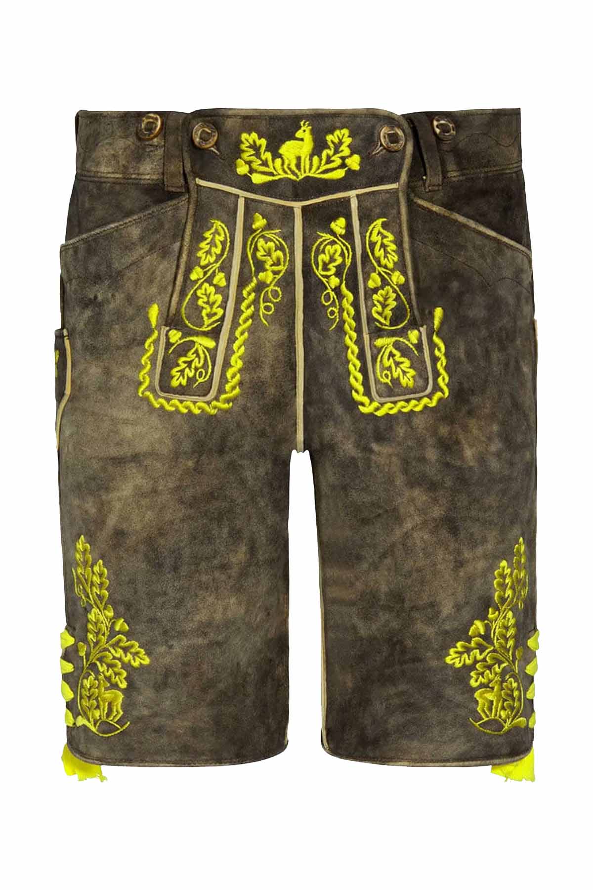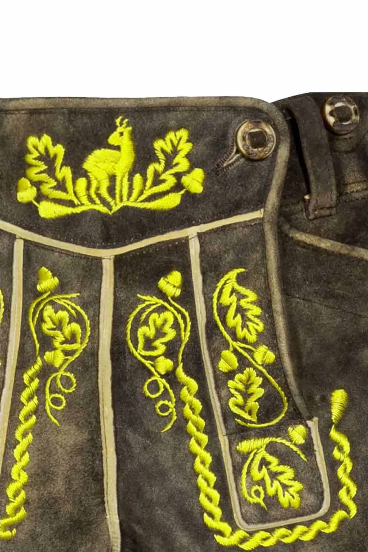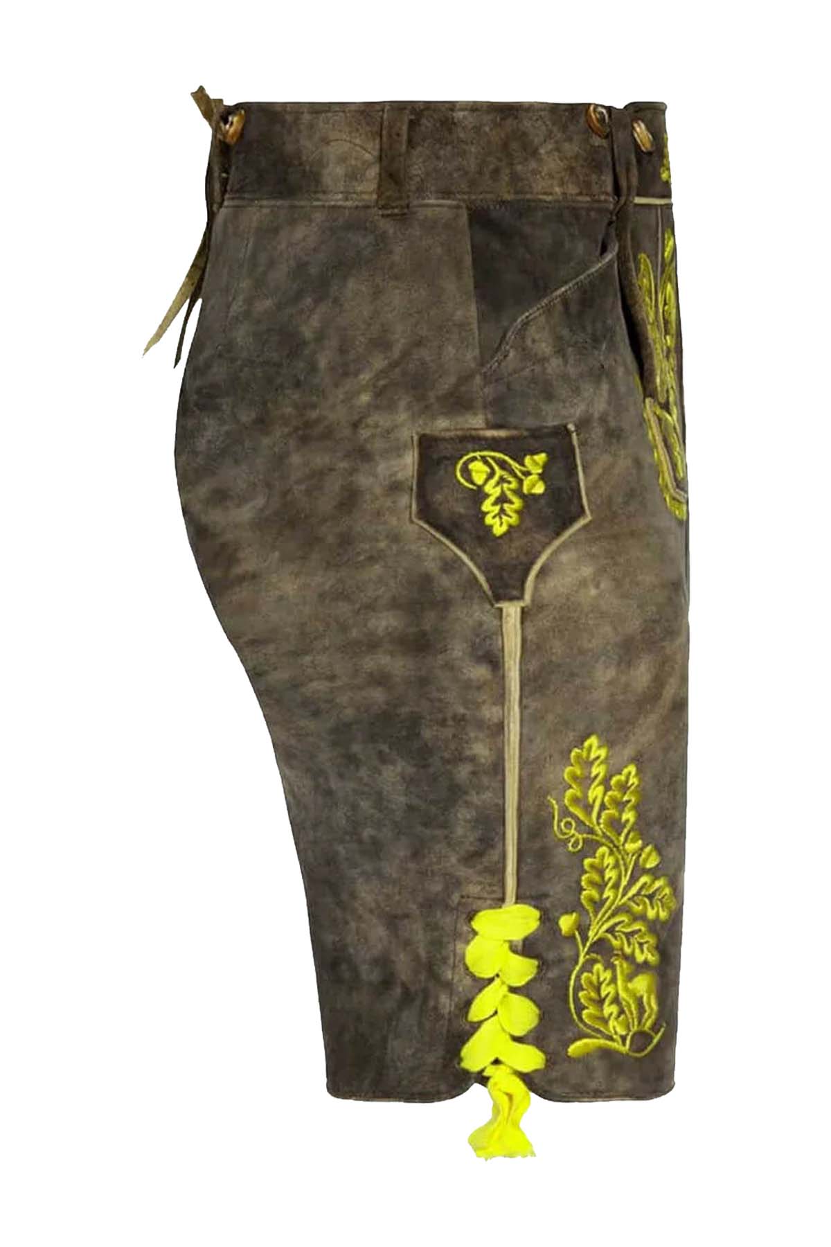 Bavaria Attire presents a distinguished piece crafted for men who appreciate tradition with a sharper, more polished finish. Made from premium goat suede leather, this design feels velvety, supple, and rich to the touch, while still holding a firm, structured shape that speaks to lasting quality. The color carries a deep olive-brown tone with smoky vintage shading, giving the surface natural depth and an aged character that looks refined rather than rough. Bright contrast embroidery across the fall-front, legs, and upper panel brings striking detail to the design, while the neat piping, clean seams, and balanced stitching highlight careful craftsmanship throughout. The fit is shaped for comfort during long wear, making it a strong choice for a complete Bavarian Outfit that looks authentic and feels easy to move in. Its traditional front flap, side pocket styling, and decorative side lace accents preserve the classic appeal expected from premium Men’s Lederhosen, while the overall finish pairs effortlessly with crisp Trachten Shirts, classic Suspenders, and well-matched Lederhosen Belts for a confident festival-ready look.