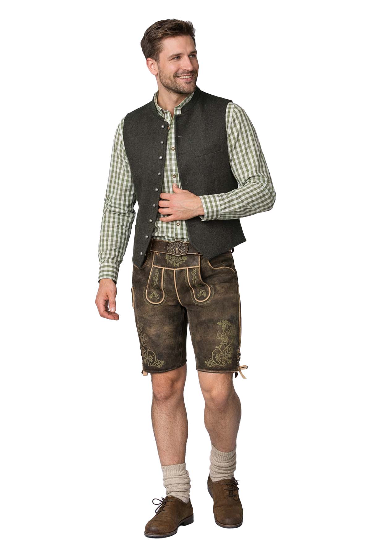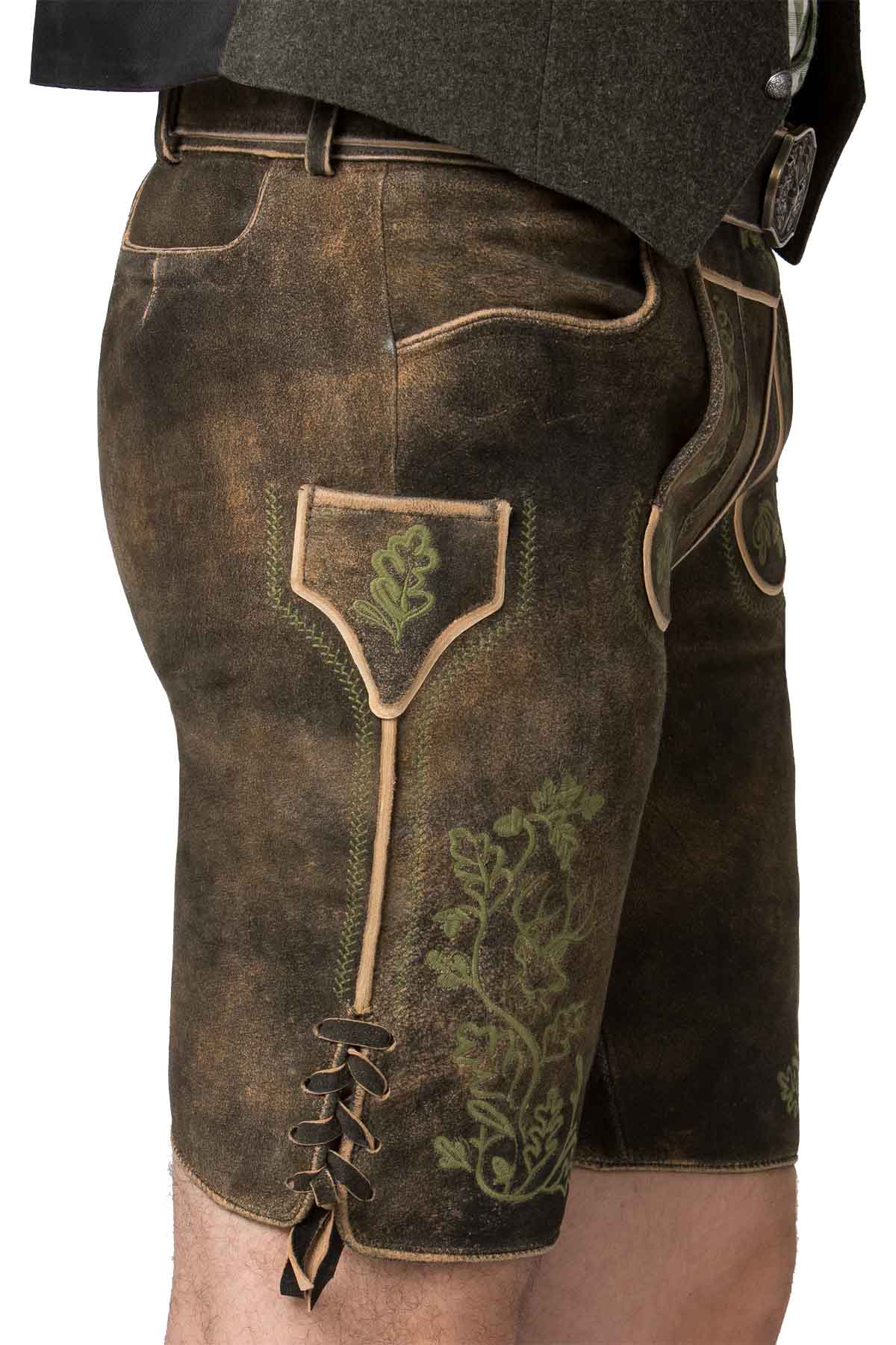 Because it balances softness, structure, and heritage detail in one polished piece. The goat suede leather feels comfortable for long wear, while the embroidered panels, contrast piping, and classic belt buckle create an authentic impression. It also styles easily with a Trachten Jacket, Bavarian Shoes, or traditional shirt for festivals.
